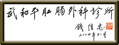 经过我们对贵地区“武和平肛肠外科诊所”主任武和平同志采访,了解到该同志认真钻研医术,在中医治疗肛肠病中取得了一定的成绩,当前肛肠疾病是多发病,为鼓励武和平同志努力工作,更好地为人类健康服务,由我部申报卫生部原部长钱信忠博士为其题写了门诊名字,并题写“精慈仁医”四字以示激励。希望武和平同志不辜负各级领导的希望,在张家口卫生局的领导下,以此为动力,在岗位上做出更大的贡献,为张家口市争荣,为题词争光。