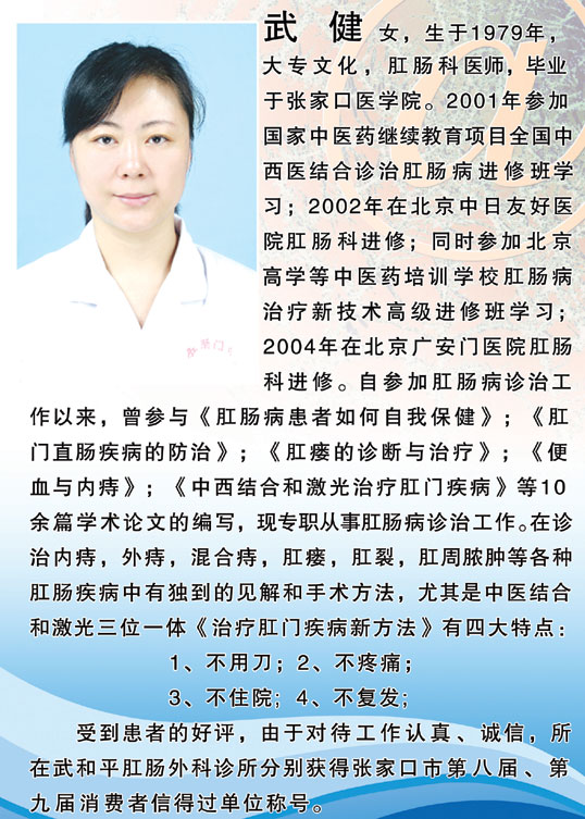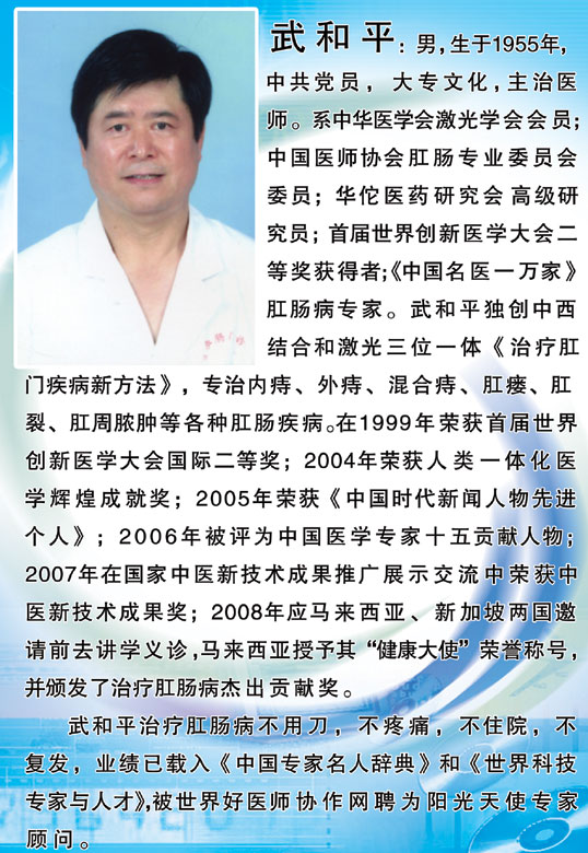 首届21世纪绿色医学暨一体化医学大会于2004年11月5日在人民大会堂隆重召开,全国人大、政协、卫生部、中国中医药管理局等国家领导人出席了本次大会的开幕式。大会由国际交流医科大学副校长余海若博士致开幕词,本次大会的宗旨是促进中医药的发展和进步,推进中医药绿色医学暨一体化医学工作的联合与协作,创建人类统一的中医药绿色自然一体化医学,以尽快实现人人享有卫生保健的目标。大会学术研讨范围是自然医学和整合医学的发展趋势及研究成果。我市肛肠病专家武和平以特邀代表身份参加本次医学大会,并在会上介绍了他在治疗肛肠病方面采用中西医结合和激光三位一体的肛门疾病的方法,以及十余年来的理论研究及临床治疗的新技术、新成果、新经验。尤其是他在治疗痔疮疾病的四大特点:1、出血少;2、疼痛轻;3、不住院;4、不复发。受到预会代表的高度评价,最后经专家组评议审定,一致认为该方法疗效确切效果好,并给武和平大夫颁发了人类一体化医学辉煌成就奖。并由联合国国际交流医科大学秘书长张学成博士给他颁发了奖杯、奖牌和荣誉证书。